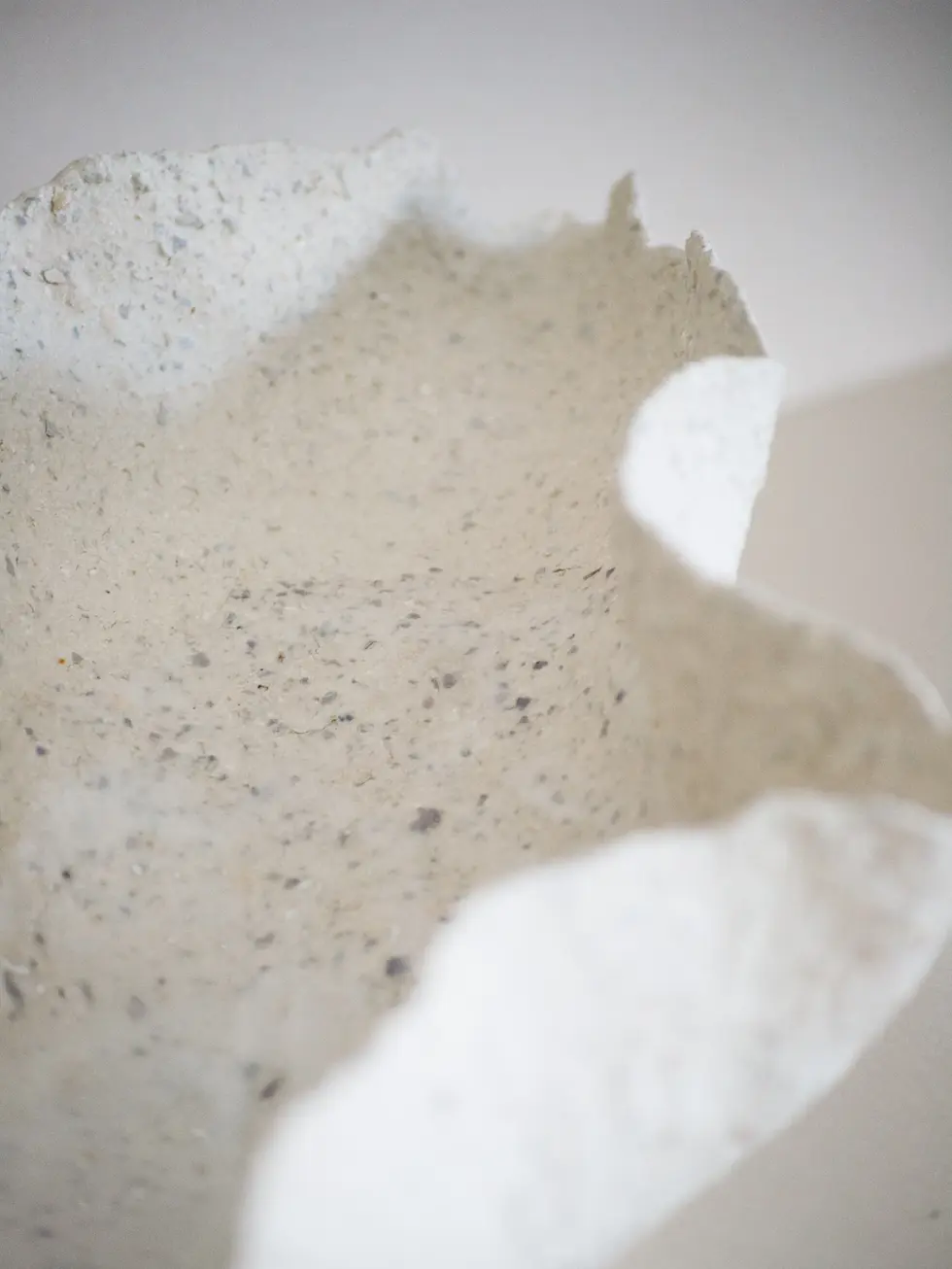 Cette pièce est façonnée à la main dans un grès brut, riche en chamotte. La matière révèle des éclats de pierre en surface, donnant une texture minérale, presque volcanique. La forme, irrégulière et creusée, oscille entre la coupe et le contenant sculptural.