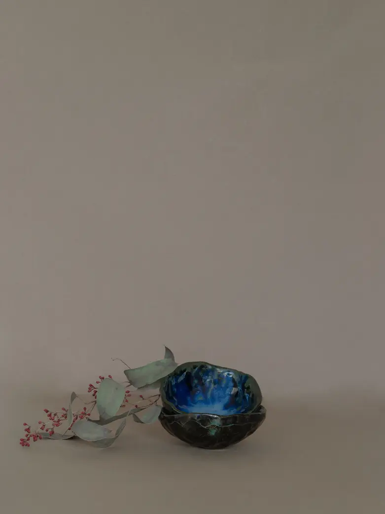 Ces coupelles, façonnées à la main, évoque les instants suspendus qui précèdent le jour. Les émaux profonds, aux nuances sombres et bleutées, captent la lumière comme un paysage encore endormi.