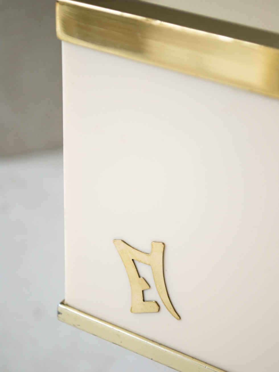 Présence du monogramme en laiton sur le devant du plateau.