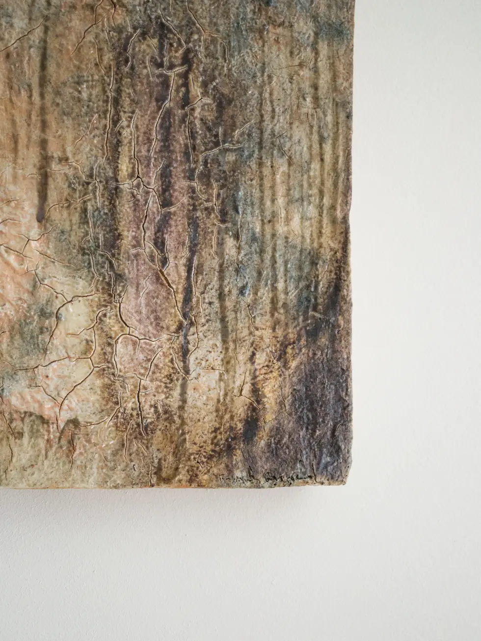 Ce tableau en céramique évoque un paysage boisé, sans jamais le nommer clairement. Des lignes verticales, diffuses et superposées, suggèrent des troncs, des silhouettes végétales, une profondeur traversée par la lumière et l’ombre.