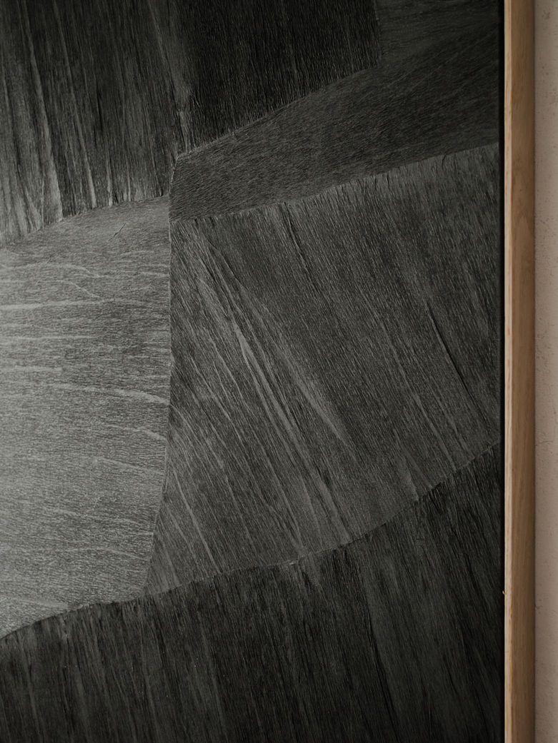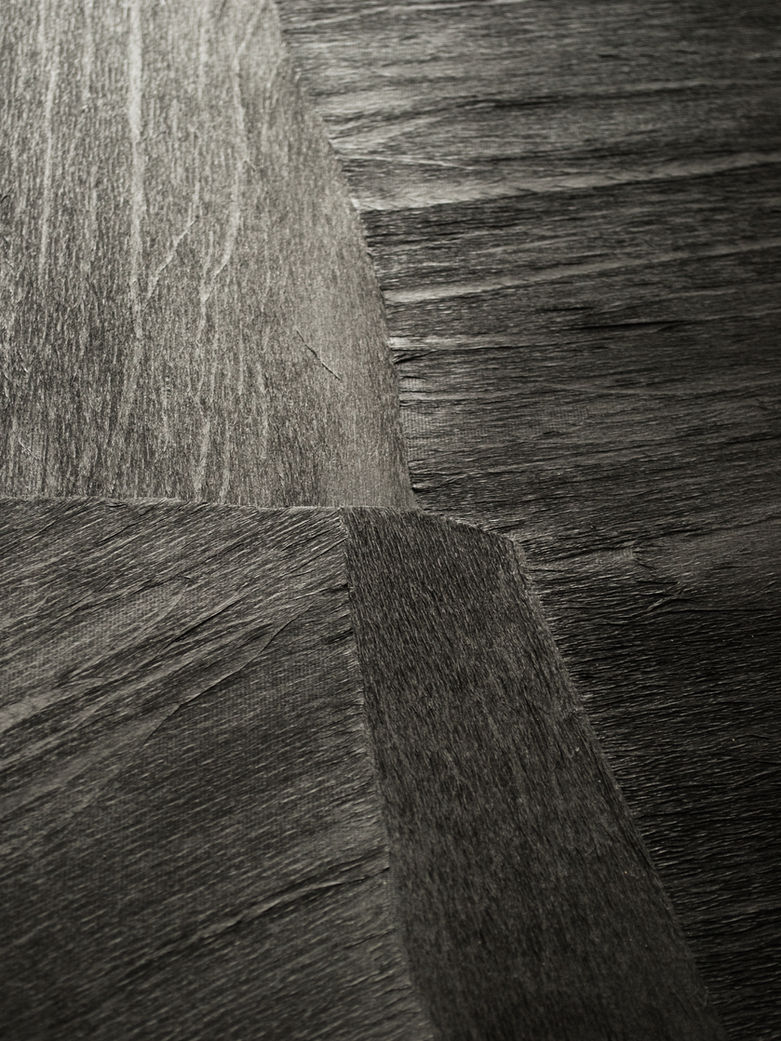 Dans la série : « Je suis la suie », j’utilise des papiers italiens que je détourne de leur usage habituel. Je les maroufle, je les teinte afin qu’ils fassent corps avec la toile et qu’ils vibrent avec la lumière ambiante.