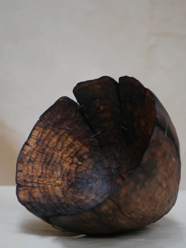 Le ciselage manuel révèle un motif vibrant et irrégulier, tandis que quelques zones subtilement brûlées viennent accentuer la profondeur et les nuances naturelles du bois.
