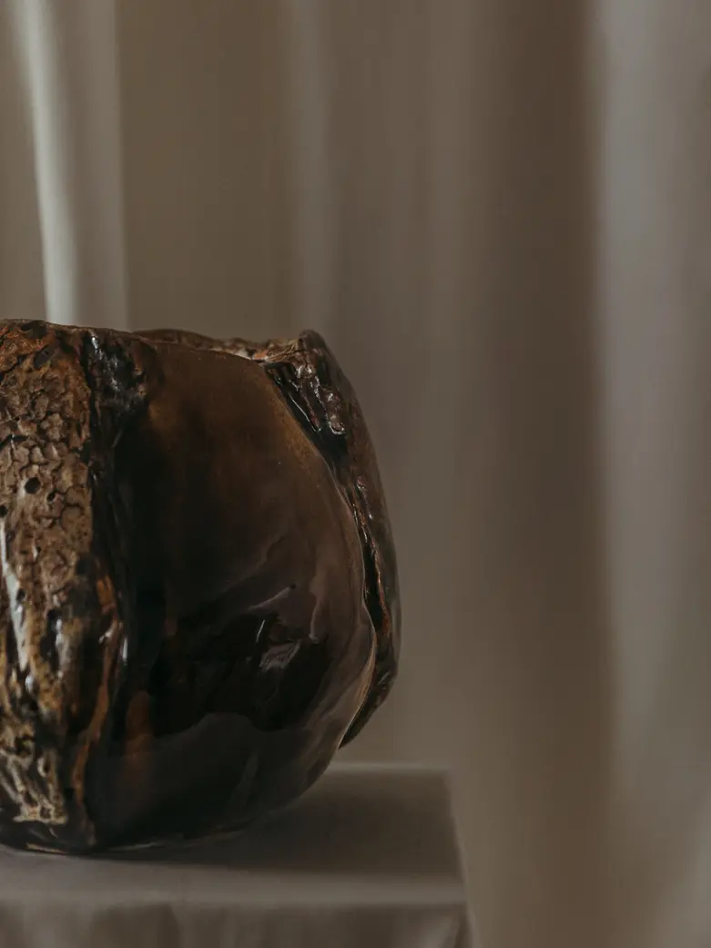 Dans ses cuissons longues au bois, la terre dialogue avec les flammes, les cendres et le temps. Chaque défournement révèle des empreintes imprévisibles, traces d’un échange entre matière et éléments.