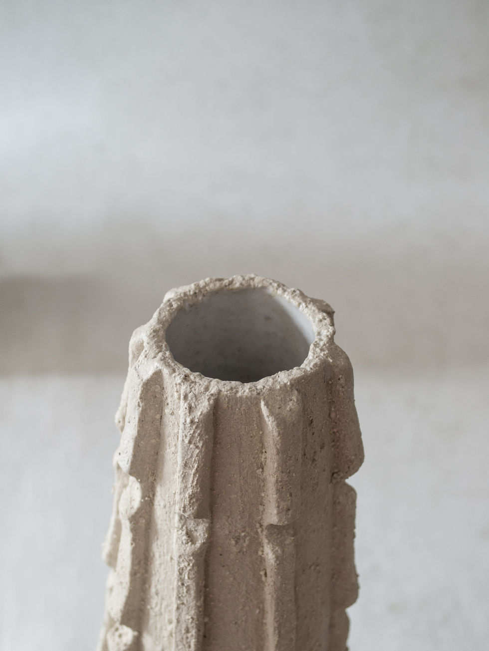 Elle est brute et façonnée dans une terre de caractère, très chamottée. Inspirée de ces longs cactus qui, en poussant vers le ciel, tendent vers un infini.